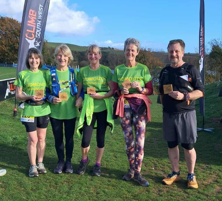 The awesome foursome, Ann Cole, Brigid Eleney-McSmith, Jo Earlam and Jane Hemsworth opted for the half marathon option. They enjoyed each other’s company (and Barry’s from Dorset from mile 5) and had great fun running through wonderful scenery in the autumnal sunshine. Their 3 trig route kept them on the western side of the Otter Valley avoiding the biggest hills and they finished together in 3:52:05.
